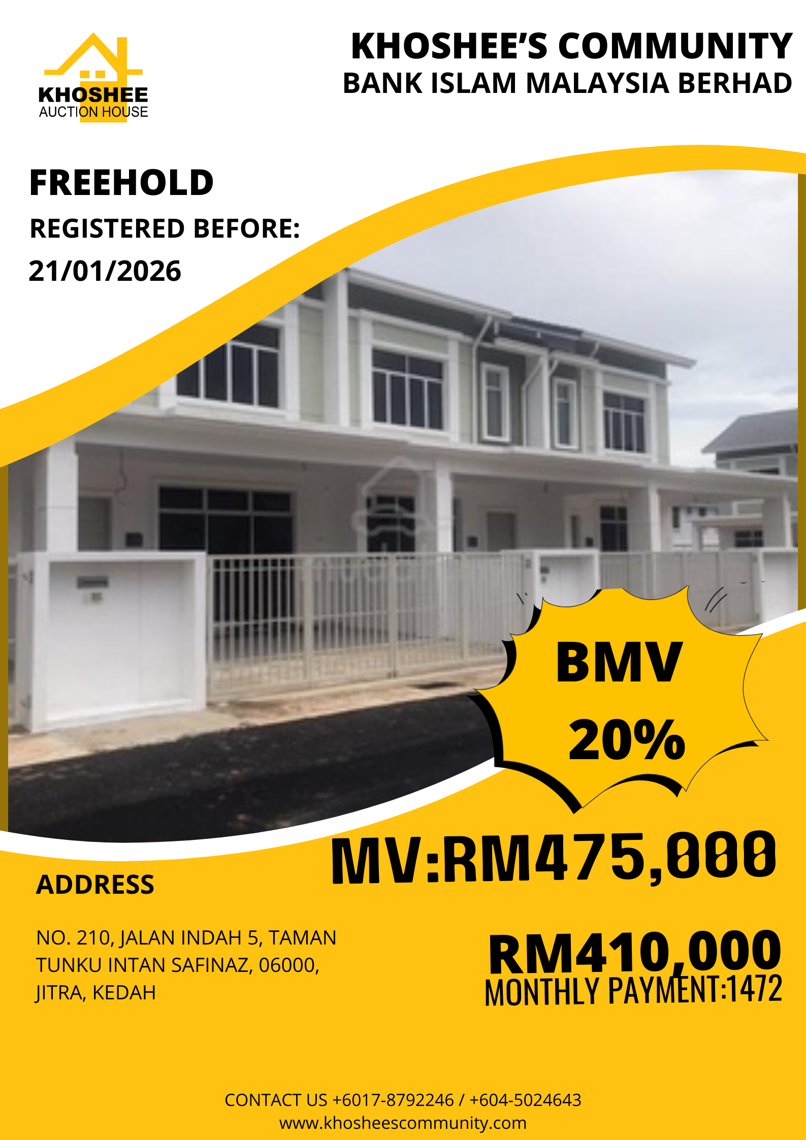 NO. 210, JALAN INDAH 5, TAMAN TUNKU INTAN SAFINAZ, 06000, JITRA, Kedah
