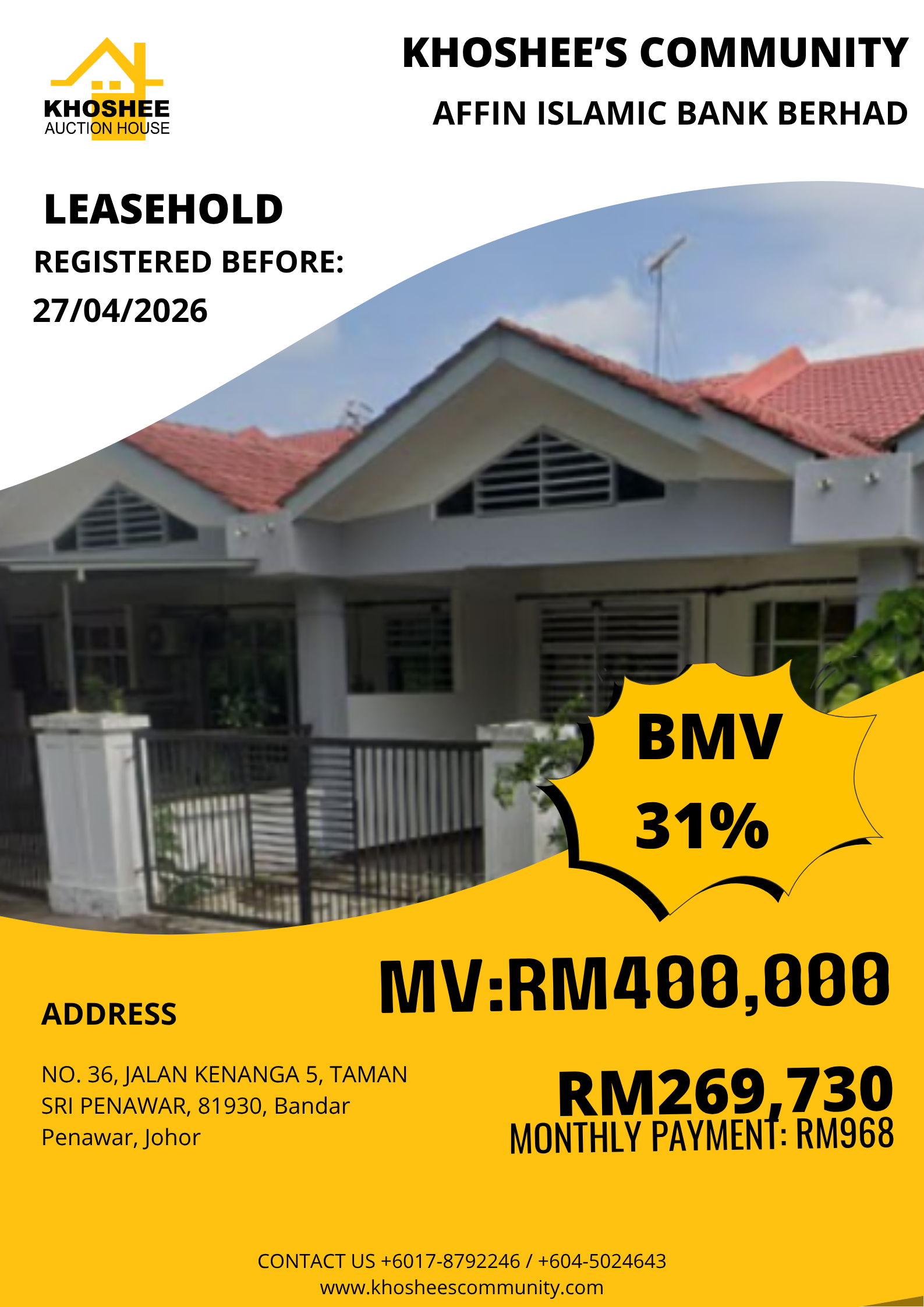 NO. 36, JALAN KENANGA 5, TAMAN SRI PENAWAR, 81930, Bandar Penawar, Johor