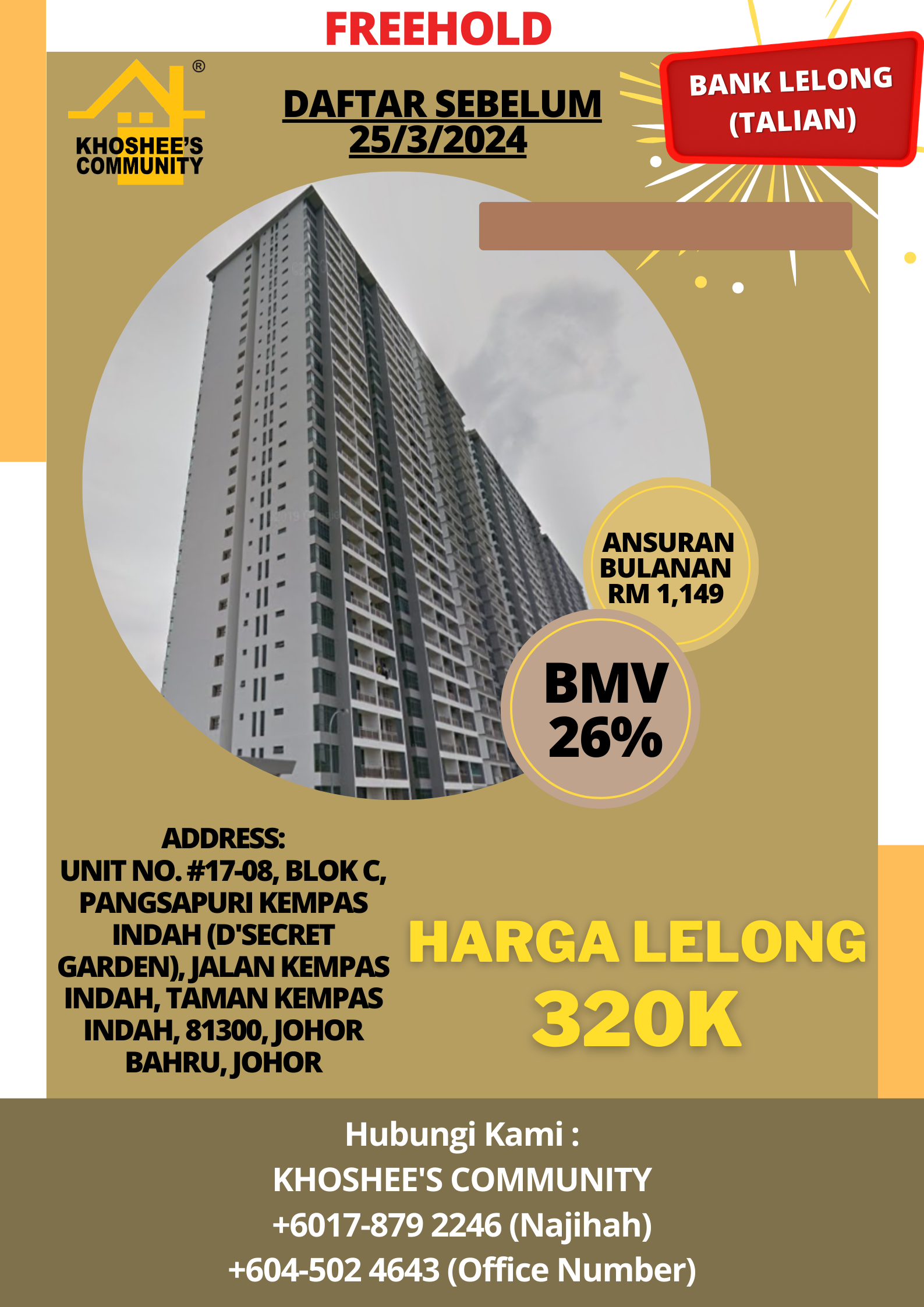 More Details: Lot Number:LOT 45240 Parcel Number:72 Storey Number:6 Building Number:M1 State:Johor Mukim:BANDAR JOH ...