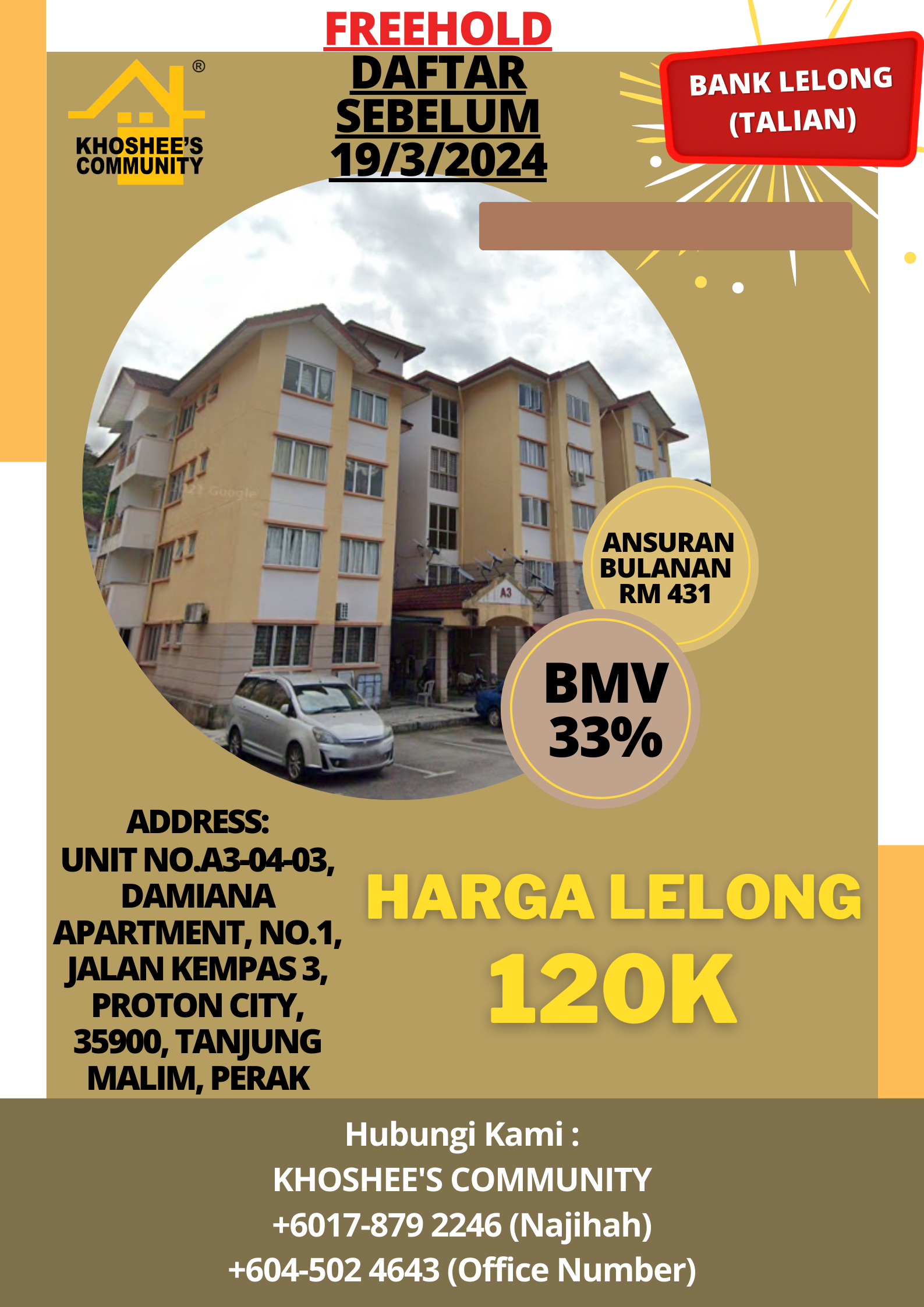 UNIT NO.A3-04-03, DAMIANA APARTMENT, NO.1, JALAN KEMPAS 3, PROTON CITY, 35900, TANJUNG MALIM, PERAK